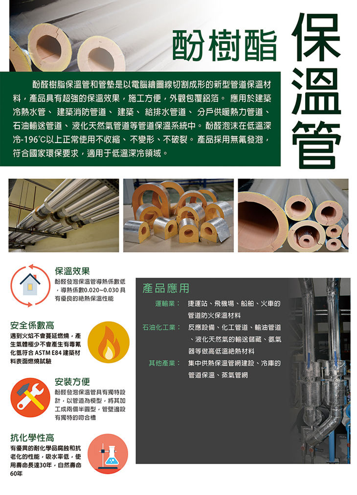 酚醛樹脂保溫管和管托是以電腦繪圖線切割成形的新型管道保溫材料,產品具有超強的保溫效果,施工方便,外觀包覆鋁箔.應用於建築冷熱水管、建築消防管道、建築給排水管道、分戶供暖熱力管道、石油輸送管道、液化天然氣管道等管道保溫系統中.酚醛泡沫在低溫深冷-196℃以上正常使用不收縮、不變形、不破裂.產品採用無氟發泡,符合國家環保要求,適用于低溫深冷領域.